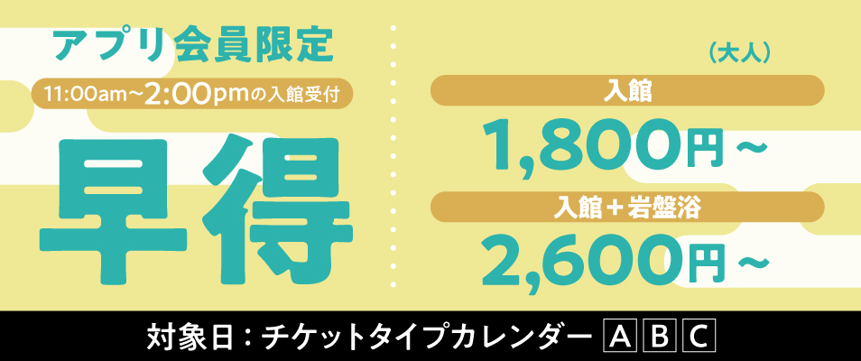 アプリ会員様限定割引☆午後2時までの入館がお得に! 夜までゆっくりお楽しみください♪