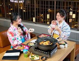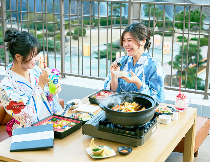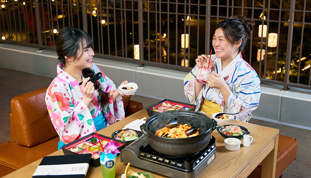선택 가능한 유카타로 스타일리시하게 BBQ를 즐겨보세요!고기, 해산물, 신선한 채소를 직접 구워서 푸르른 야외 가든 테라스에서 최고의 시간을 보내세요. 전천후 오픈 테라스에서 비가 와도 걱정 없이 BBQ를 즐기실 수 있습니다.