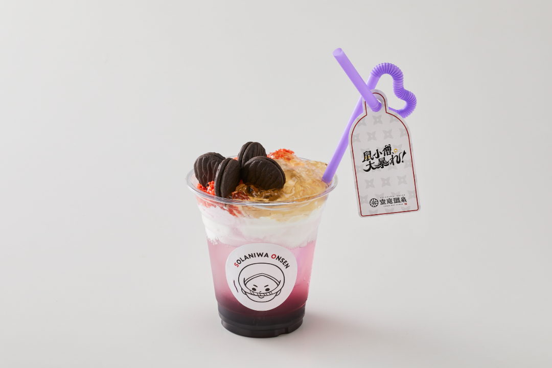 芳醇な巨峰が香るソーダに、ぷるぷるゼリーとサクサクのココアクッキーを合わせた新食感ソーダ。鼠小僧のラベルやタグで彩られた、賑やかでカラフルな見た目も楽しい一杯です。