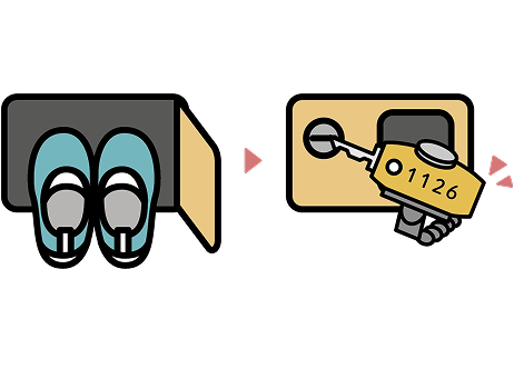 エントランスで靴を脱ぎ、下足ロッカーに預けてください。下足ロッカーキーはICキーになっており、館内ではICキーで全ての精算を行います。ICキーはお財布と同じ役割を果たすため、厳重な管理をお願いします。