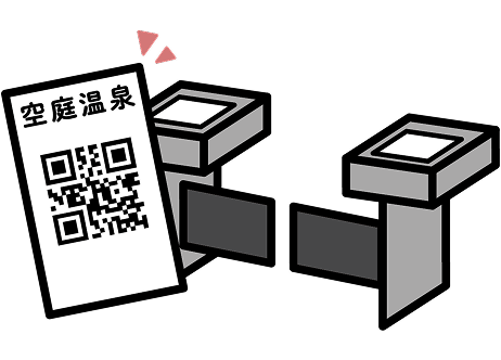 請在大番所(櫃檯)或利用自動結帳機,一併結算並支付入館費與館內使用費(團體支付時,全體成員使用IC鑰匙一次性支付)。使用空庭會員卡點數的賓客,有變更預售票券使用內容的賓客,皆不可使用自動結帳機。請至大番所的窗口結帳。